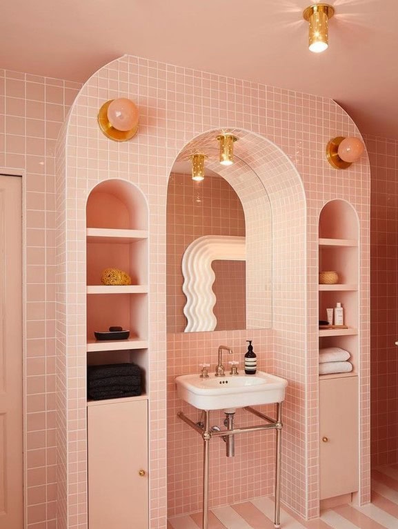 Το millennial pink μπορεί να πέρασε το peak του, αλλά αν το χρησιμοποιήσεις έξυπνα, δείχνει πιο φρέσκο από ποτέ. Το μυστικό είναι να σπάσεις τη μονοτονία. Διάλεξε έναν νιπτήρα σε ροζ απόχρωση, παίξε με πλακάκια σε τετράγωνο σχήμα και τόλμησε να βάψεις τον τοίχο σε ελαφρώς διαφορετικό ροζ. Όταν οι αποχρώσεις διαφοροποιούνται ελαφρώς μεταξύ τους, το αποτέλεσμα είναι παιχνιδιάρικο αλλά όχι κουραστικό.