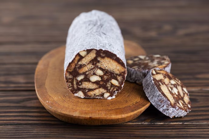 Τυλίγουμε τη λαδόκολλα με διάφανη μεμβράνη και πιέζουμε καλά με τα χέρια μας για να δώσουμε το χαρακτηριστικό σχήμα του κορμού.