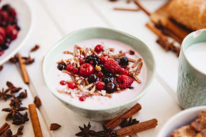 Για αυτό το σνακ, προσθέστε μια πρέζα κανέλα σε περίπου ¾ φλιτζανιού απλό στραγγιστό γιαούρτι χαμηλών λιπαρών. Αν θέλετε περισσότερη γεύση, μπορείτε να προσθέσετε μισό φλιτζάνι μάνγκο ή μούρα.