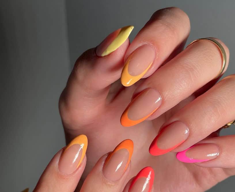 Το κλασικό γαλλικό μανικιούρ αποκτά καλοκαιρινό twist με αποχρώσεις sunset. Οι λευκές άκρες αντικαθίστανται από απαλά ντεγκραντέ σε κοραλί, ροδακινί και χρυσοκίτρινο.