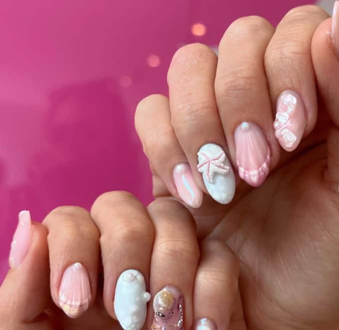 Μια άλλη ωραία ιδέα είναι να «παίξετε» με το παστέλ ροζ και το λευκό και να δημιουργήσετε ένα άκρως καλοκαιρινό μανικιούρ. Συνδυάστε τα κοχύλια, τους αστερίες και τα μαργαριτάρια από τα οστρακοειδή για να πετύχετε το τέλειο θεματικό 3D mani.