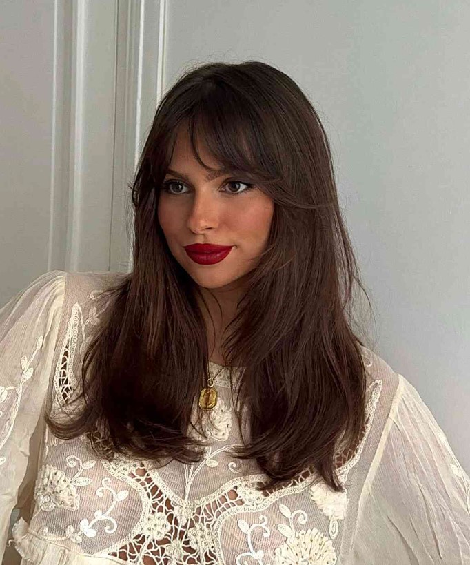 Τα λεπτά layers που πλαισιώνουν το πρόσωπο μαλακώνουν τα έντονα χαρακτηριστικά, προσθέτοντας παράλληλα μια παιχνιδιάρικη, θηλυκή πινελιά ακόμη και στο πιο κοντό κούρεμα. Τα curtain bangs δίνουν έμφαση στα μάτια και τα ζυγωματικά, κάνοντας τη συνολική εμφάνιση ιδιαίτερα κομψή και καθόλου ατημέλητη -ακόμα κι αν είναι.