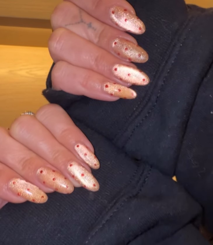 Η Vanessa Hudgens, γνωστή για την αγάπη της στα μακριά, statement νύχια, έδωσε το σύνθημα για φέτος. Η κορυφαία nail artist Zola Ganzorigt επιμελήθηκε ένα look που ισορροπεί ανάμεσα στη λάμψη και τη διακριτικότητα: ένα V-day μανικιούρ με παιχνιδιάρικα κόκκινα polka dots πάνω σε μια nude-χρυσή βάση.