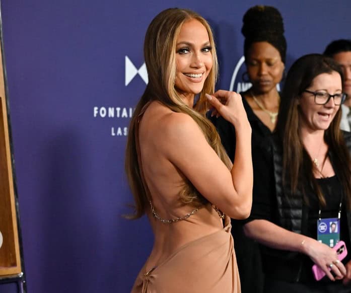 Η Lopez έκανε έντονα κοψίματα με bronzer και τόνισε το βλέμμα με σκιά σε απόχρωση mocha mousse, έντονη γραμμή eyeliner και πολλές στρώσεις μαύρης μάσκαρα.