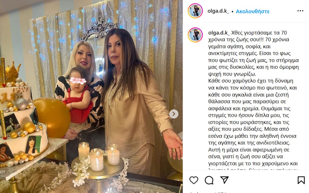 «Είσαι και θα είσαι πάντα η πιο ξεχωριστή γυναίκα στη ζωή μου. Μαμά, σε αγαπώ περισσότερο απ’ όσο μπορείς να φανταστείς!» καταλήγει στην ανάρτησή της, η κόρη της Άντζελας Δημητρίου, Όλγα Κιουρτσάκη.