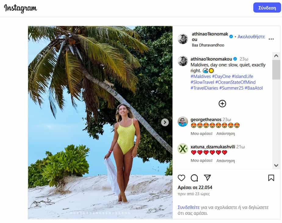 Η Αθηνά Οικονομάκου μετέφερε τον ελληνικό καύσωνα στις Μαλδίβες. Η γνωστή ηθοποιός είναι στο εξωτικό μέρος μαζί με τον αγαπημένο της, Μπρούνο Τσερέλα.