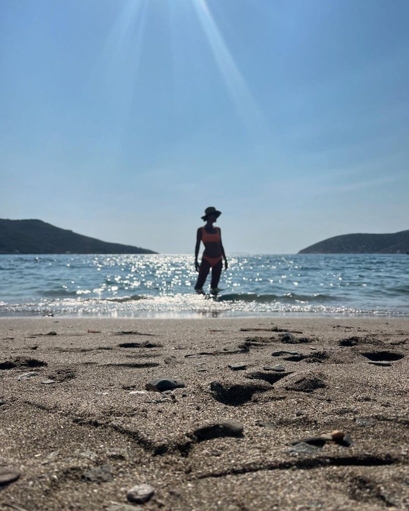Σε ανάρτηση που έκανε πρόσφατα δημοσίευσε μερικά στιγμιότυπα από διάφορα σημεία του νησιού, ενώ σε ένα από αυτά εμφανίζεται η ίδια με το μαγιό, το παρεό της και ένα ψάθινο καπέλο να εξερευνεί τα σοκάκια του νησιού.