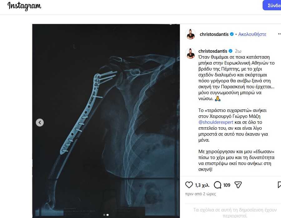 Ο Χρήστος Δάντης τραυματίστηκε στο χέρι το βράδυ της περασμένης Πέμπτης και έτσι μπήκε στο νοσοκομείο για επέμβαση.