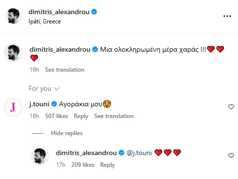 «Μια ολοκληρωμένη μέρα χαράς», έγραψε στην ανάρτησή του ο Δημήτρης Αλεξάνδρου και η Ιωάννα Τούνη έσπευσε να του σχολιάσει με αγάπη: «Αγοράκια μου».