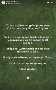 Στην ανάρτησή της, η Ζουγανέλη παραδέχθηκε το περιστατικό και ανακοίνωσε ότι δεν θα οδηγήσει το μηχανάκι της για τις επόμενες 30 ημέρες. «Ακόμα και 0,1 πάνω από το όριο είναι πάνω από το όριο. Νόμος είναι νόμος και ισχύει για όλους», έγραψε χαρακτηριστικά, ευχόμενη στους ακολούθους της καλές γιορτές και προτρέποντάς τους να προσέχουν.
