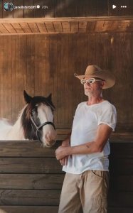 Σε άλλη φωτογραφία, ο ίδιος εμφανίζεται μέσα σε στάβλο, δίπλα σε ένα άλογο, χαμογελαστός και γαλήνιος.