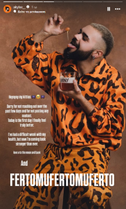 Μέσα από ανάρτησή του στα μέσα κοινωνικής δικτύωσης, ο τραγουδιστής εξήγησε στους ακολούθους του πως η περασμένη εβδομάδα ήταν ιδιαίτερα δύσκολη, γι’ αυτό και δεν ήταν σε θέση να επικοινωνεί μαζί τους ή να δημοσιεύει περιεχόμενο. Παράλληλα, ζήτησε συγγνώμη για την απουσία του και τόνισε πως η σημερινή είναι η πρώτη ημέρα που αισθάνεται πραγματικά καλύτερα.