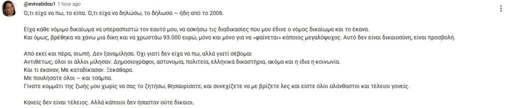 «Ό,τι είχα να πω, το είπα. Ό,τι είχα να δηλώσω, το δήλωσα, ήδη από το 2006. Είχα κάθε νόμιμο δικαίωμα να υπερασπιστώ τον εαυτό μου, να ασκήσω τις διαδικασίες που μου έδινε ο νόμος δικαίωμα και το έκανα. Και όμως, βρέθηκα να χάνω μια δίκη και να χρωστάω 93.000 ευρώ, μόνο και μόνο για να “φαίνεται” κάποιος μεγαλόψυχος. Αυτό δεν είναι δικαιοσύνη, είναι προσβολή. Από εκεί και πέρα, σιωπή. Δεν ξαναμίλησα. Όχι γιατί δεν είχα να πω, αλλά γιατί σέβομαι. Αντιθέτως, όλοι οι άλλοι μίλησαν. Δημοσιογράφοι, αστυνομία, πολιτεία, ελληνικά δικαστήρια, ακόμα και η ίδια η κοινωνία. Και τι έκαναν; Με καταδίκασαν. Ξεκάθαρα. Με πουλήσατε όλοι και τσάμπα. Γίνατε κομμάτι της ζωής μου χωρίς να σας το ζητήσω, θησαυρίσατε, και συνεχίζετε να με βρίζετε λες και είστε όλοι αλάνθαστοι και τέλειοι γονείς», έγραψε αρχικά η Εύη Βατίδου.