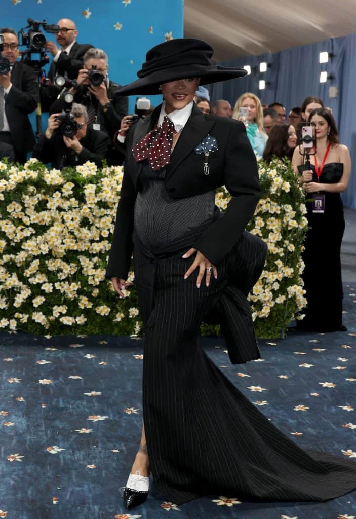 Ο A$AP Rocky ανέβηκε μόνος τα σκαλιά του Met, φορώντας ένα εντυπωσιακό μάλλινο κοστούμι εμπνευσμένο από τη γενέτειρά του το Χάρλεμ, δημιουργία της δικής του μάρκας, AWGE. Η Ριάνα έκανε την πολυαναμενόμενη εμφάνισή της μία ώρα αργότερα συγκεντρώνοντας όλα τα φώτα και επισφραγίζοντας το λαμπερό φινάλε των αφίξεων του Met Gala. Επέλεξε μια κομψή μάξι δημιουργία Marc Jacobs που αναδείκνυε την φουσκωμένη κοιλίτσα της ενώ ολοκλήρωσε το σύνολό της με ένα τεράστιο μαύρο καπέλο, μυτερές γόβες και vintage κοσμήματα.