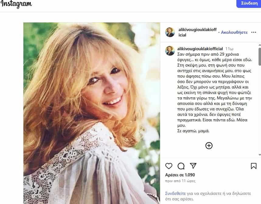 «Σαν σήμερα πριν από 29 χρόνια έφυγες… Κι όμως, κάθε μέρα είσαι εδώ. Στη σκέψη μου, στη φωνή σου που αντηχεί στις αναμνήσεις μου, στο φως που άφησες πίσω σου. Μου λείπεις όσο δεν μπορούν να περιγράψουν οι λέξεις. Όχι μόνο ως μητέρα, αλλά και ως εκείνη τη σπάνια ψυχή που φώτιζε τα πάντα γύρω της.