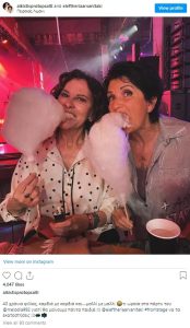 Ανέμελες και χαμογελαστές ποζάρουν η Άλκηστις Πρωτοψάλτη και η Ελευθερία Αρβανιτάκη τρώγοντας μαλλί της γριάς.