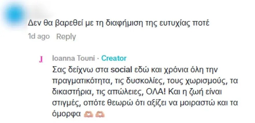 Από κάτω ακολούθησαν διάφορα σχόλια, με ένα από αυτά να αναφέρει: «Δεν θα βαρεθεί τη διαφήμιση της ευτυχίας ποτέ». Η Ιωάννα Τούνη εξήγησε πως εφόσον έχει επιλέξει να δείχνει όλες τις πτυχές της ζωής της, θα προβάλλει και τις όμορφες στιγμές.