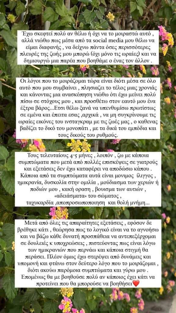 «Έχω σκεφτεί πολύ αν θέλω ή όχι να το μοιραστώ αυτό, αλλά νιώθω πως μέσα από τα social media μου θέλω να είμαι διαφανής, να δείχνω πάντα όσο περισσότερες πλευρές της ζωής μου μπορώ και να δημιουργώ μία παρέα που βοηθάμε ο ένας τον άλλον», γράφει αρχικά στο story της και προσθέτει: