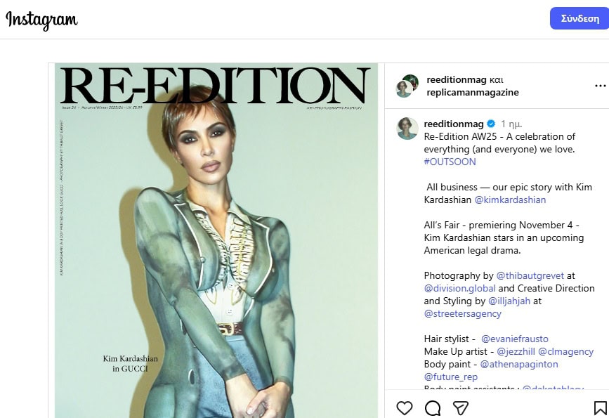 Όπως φαίνεται από τα εξώφυλλα που δημοσίευσε στο Instagram το περιοδικό, η τηλεπερσόνα πόζαρε γυμνή στον φωτογραφικό φακό «φορώντας» μόνο body paint.