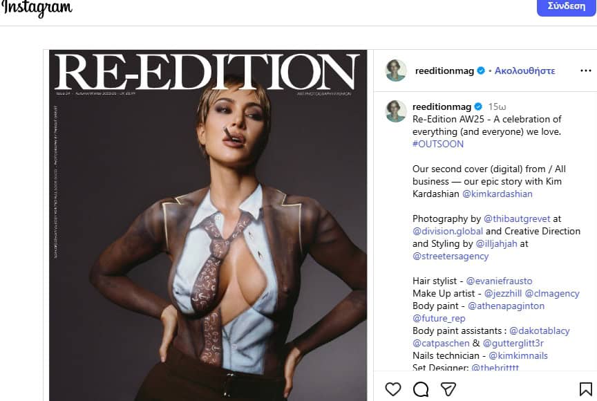 Η τηλεπερσόνα Κιμ Καρντάσιαν έκανε μια άκρως αποκαλυπτική φωτογράφιση για τις ανάγκες του περιοδικού Re-Edition. Πέταξε τα ρούχα της και ντύθηκε με… μπογιές.