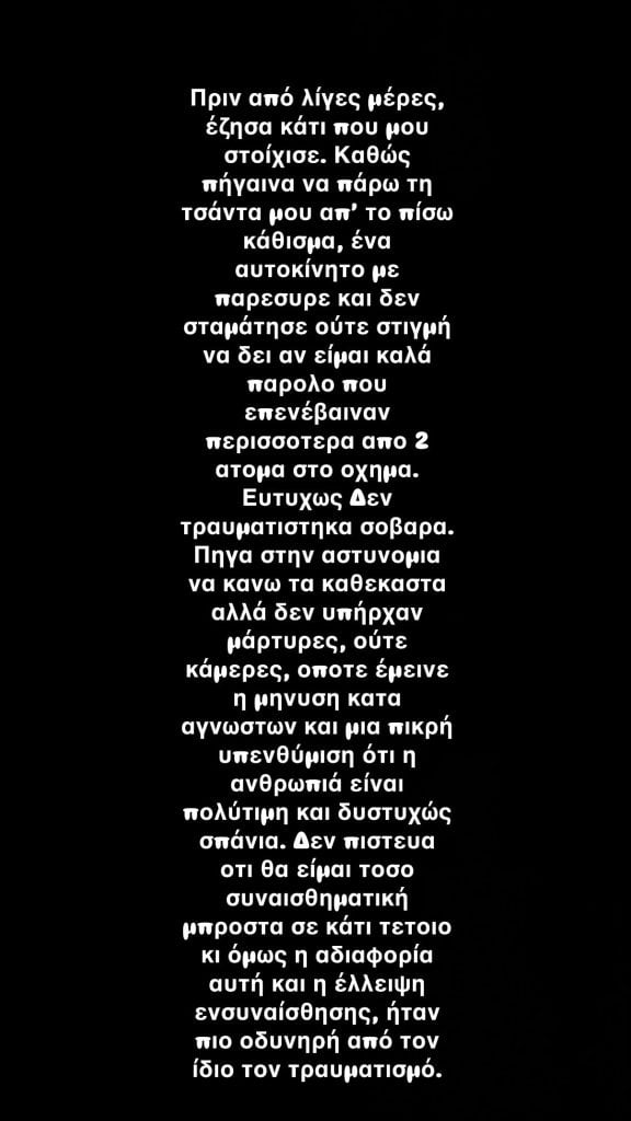 «Πριν από λίγες μέρες έζησα κάτι που μου στοίχισε. Καθώς πήγαινα να πάρω την τσάντα μου απ’ το πίσω κάθισμα, ένα αυτοκίνητο με παρέσυρε και δεν σταμάτησε ούτε στιγμή να δει αν είμαι καλά, παρόλο που επέβαιναν περισσότερα από 2 άτομα στο όχημα.
