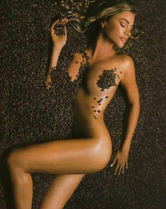 Στην εν λόγω φωτογραφία η Σοφία Βεργκάρα ποζάρει γυμνή, ξαπλωμένη πάνω σε χιλιάδες κόκκους καφέ.