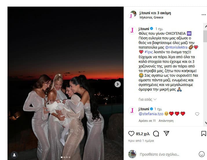 «Φίλες που ‘γίναν ΟΙΚΟΓΕΝΕΙΑ. Πόση ευλογία που μας αξίωσε ο Θεός να βαφτίσουμε όλες μαζί την πατατούλα μας. Εύχομαι να πάρει λίγα από όλα τα καλά στοιχεία που έχουμε και οι 3 χαζονονές της, γιατί αν πάρει από τα στραβά μας, ζήτω που καήκαμε! Σας αγαπώ ως τον ουρανό!