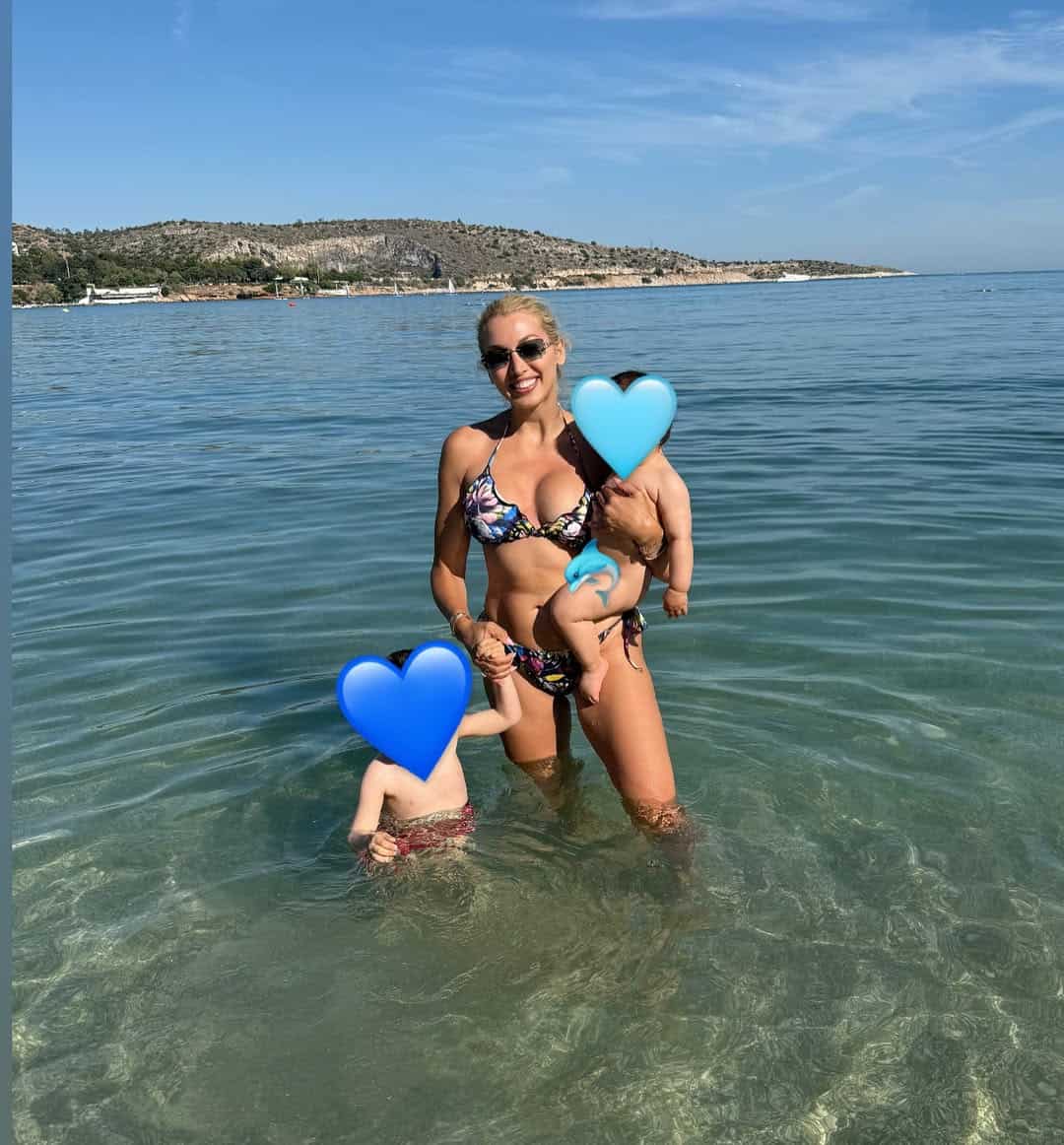Συγκεκριμένα, ανέβασε δύο φωτογραφίες από την απόδραση που έκανε με την οικογένειά της στον προσωπικό της λογαριασμό στο Instagram. H παρουσιάστρια φαίνεται να κρατάει το χέρι του μεγάλου της γιου, ενώ στην αγκαλιά της έχει τον μικρότερο, μέσα στη θάλασσα.