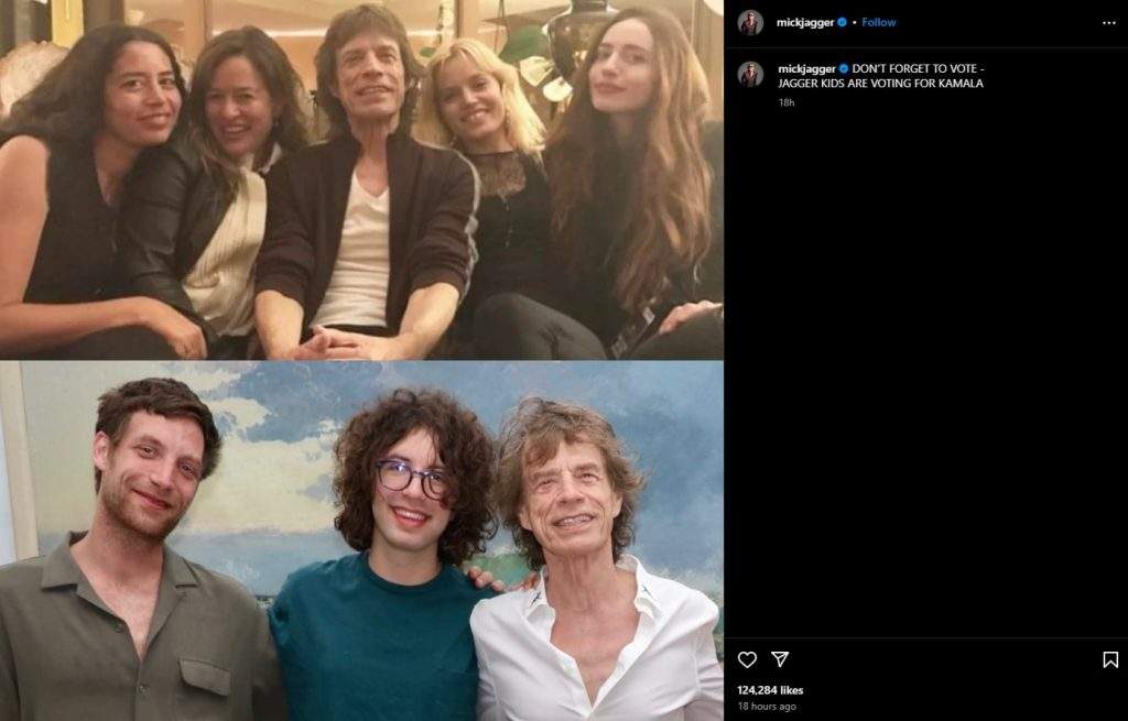 Σε ανάρτησή του στο Instagram, ο θρυλικός τραγουδιστής των Rolling Stones μοιράστηκε φωτογραφίες με τα παιδιά του -τις τέσσερις κόρες του, Karis, Jade, Elizabeth και Georgia May, καθώς και τους δύο γιους του, James και Lucas – επισημαίνοντας «μην ξεχάσετε να ψηφίσετε. Τα παιδιά του Τζάγκερ ψηφίζουν Κάμαλα Χάρις».