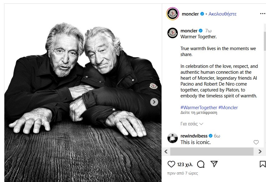 Στην καινούρια καμπάνια του ιταλικού οίκου Moncler: «Warmer Together» όμως οι Ρόμπερτ Ντε Νίρο και Αλ Πατσίνο συμπρωταγωνιστούν.