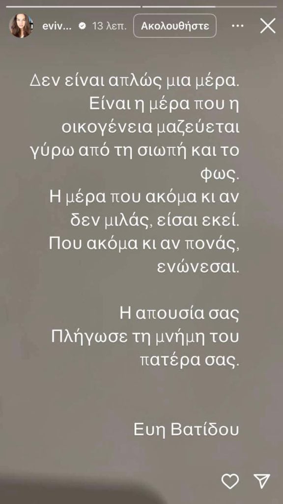 «Η απουσία σας… Πλήγωσε τη μνήμη του πατέρα σας. Και όμως, η σιωπή σας είναι η πιο δυνατή κραυγή… Ξέρω πως είναι δύσκολο, ξέρω πως σας πονάει. Μα η αλήθεια δεν χάνεται. Αυτός ο πόνος, κάποτε θα γίνει δύναμη», καταλήγει στην ανάρτησή της.