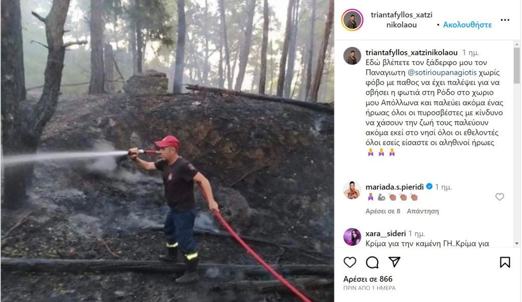 Ο Τριαντάφυλλος, περήφανος για τις προσπάθειες του ξαδέλφου του ανέβασε φωτογραφία του γράφοντας στη λεζάντα: «Εδώ βλέπετε τον ξάδερφο μου τον Παναγιωτη @sotirioupanagiotis χωρίς φόβο με πάθος να έχει παλέψει για να σβήσει η φωτιά στη Ρόδο στο χωριό μου Απόλλωνα και παλεύει ακόμα ένας ήρωας όλοι οι πυροσβέστες με κίνδυνο να χάσουν την ζωή τους παλεύουν ακόμα εκεί στο νησί όλοι οι εθελοντές όλοι εσείς είσαστε οι αληθινοί ήρωες».