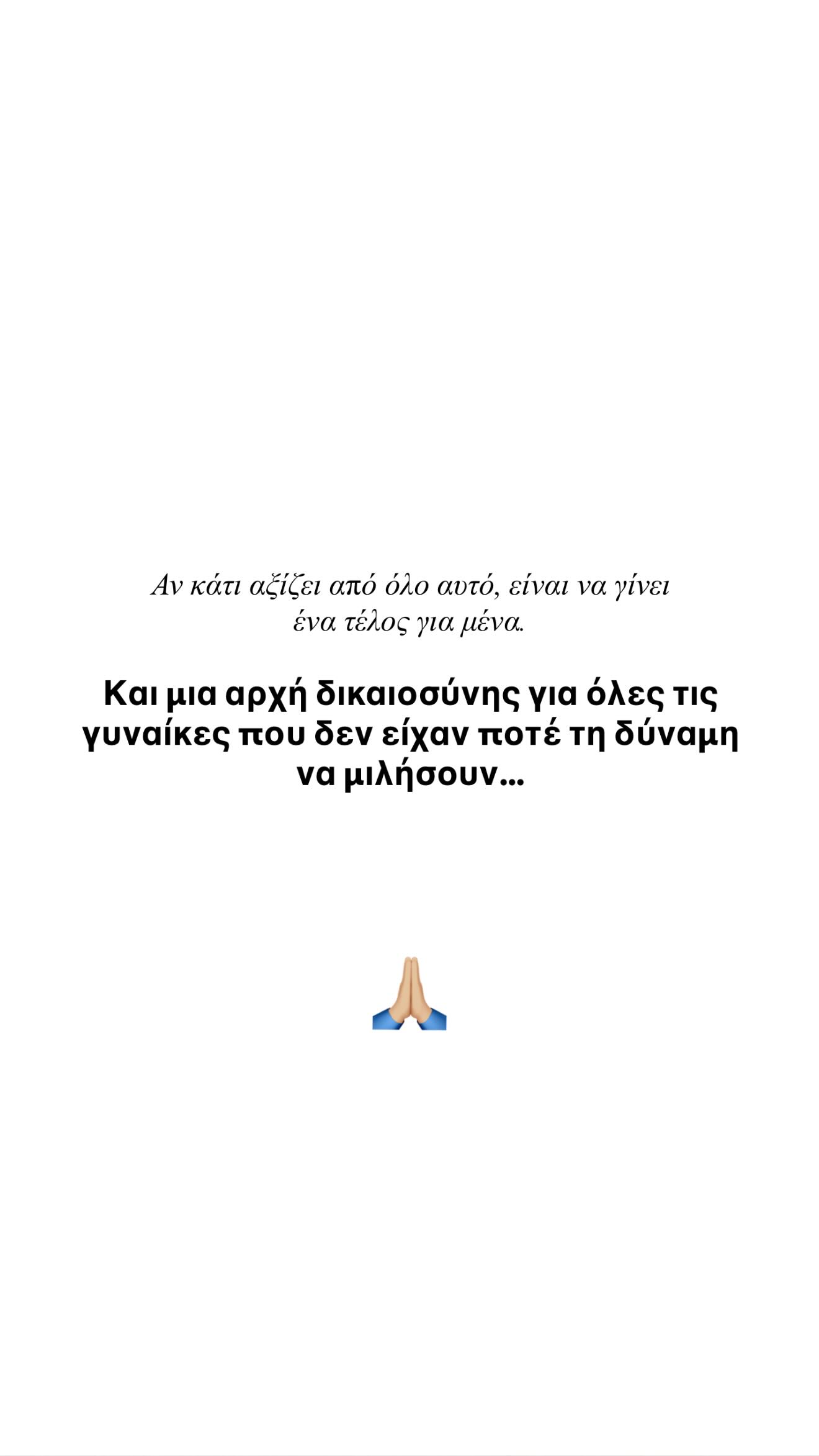 Αν εγώ, με τον δημόσιο λόγο που θεωρητικά έχω, με την “επιρροή”, με τα μέσα, με τον κόσμο που με στηρίζει, ακόμη παλεύω να αποδείξω το αυτονόητο -ότι είμαι το θύμα- τότε τι γίνεται με όλες αυτές τις κοπέλες που δεν έχουν τίποτα να τις προστατεύσει; Που δεν ξέρουν πού να απευθυνθούν; Που φοβούνται ότι δεν θα τις πιστέψει κανείς; ΔΕΝ ΠΑΛΕΥΩ ΜΟΝΟ ΓΙΑ ΕΜΕΝΑ ΠΙΑ!