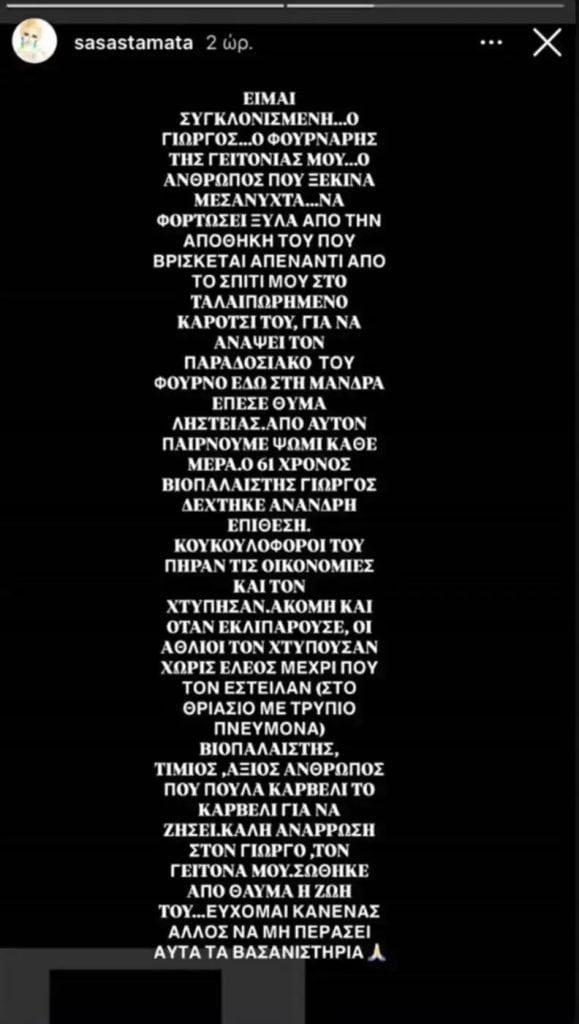 «Είμαι συγκλονισμένη… ο Γιώργος… ο φούρναρης της γειτονιάς μου… ο άνθρωπος που ξεκινά μεσάνυχτα να φορτώσει ξύλα από την αποθήκη του, απέναντι από το σπίτι μου, στο ταλαιπωρημένο καρότσι του για να ανάψει τον παραδοσιακό του φούρνο εδώ στη Μάνδρα, έπεσε θύμα ληστείας. Από αυτόν παίρνουμε ψωμί κάθε μέρα. Ο 61χρονος βιοπαλαιστής Γιώργος δέχτηκε άνανδρη επίθεση», έγραψε η Σάσα Σταμάτη σε ανάρτηση που έκανε στα social media.