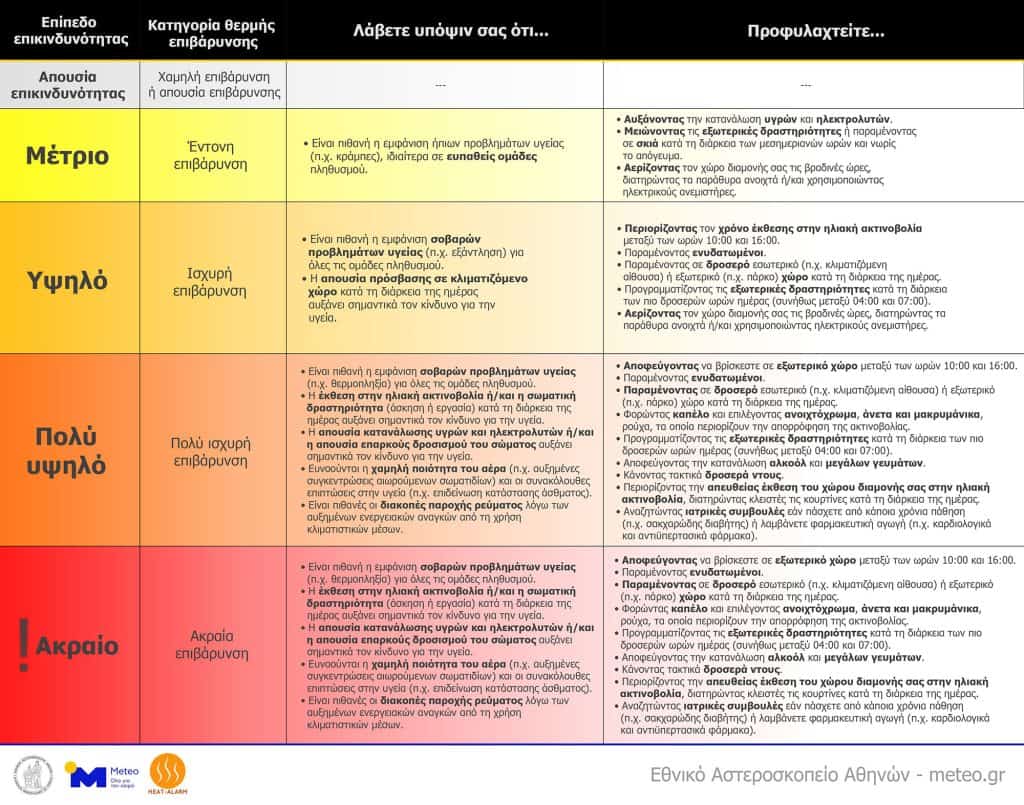 Θα πρέπει να τονιστεί ότι οι συνθήκες παρατεταμένης θερμής επιβάρυνσης σε συνδυασμό με την απουσία δροσισμού και θερμικής ανακούφισης κατά τη διάρκεια της νύχτας αυξάνουν σημαντικά την επικινδυνότητα για την ανθρώπινη υγεία. Για αυτό συνίσταται ισχυρά η εφαρμογή μέτρων προστασίας (π.χ. τακτικά δροσερά ντους) από όλες τις πληθυσμιακές ομάδες, και ιδιαίτερα από τις περισσότερο ευπαθείς (ηλικιωμένοι/ες, εργαζόμενοι/ες σε εξωτερικούς χώρους, παιδιά, εγκυμονούσες, άνθρωποι που πάσχουν από χρόνιες παθήσεις κ.α.). Περισσότερες σχετικές πληροφορίες παρέχονται στην επόμενη εικόνα.