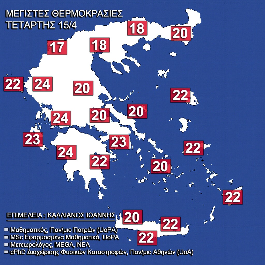 Ακολουθούν οι μέγιστες θερμοκρασίες ανά περιοχή έως και την Παρασκευή 17 Απριλίου:».