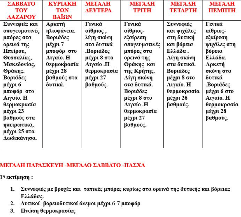 Μεγάλη Τρίτη: Γενικά αίθριος με εξαίρεση απογευματινές μπόρες στα ορεινά της Θράκης και της Κρήτης. Λίγη σκόνη στα δυτικά. Βορειάδες μέχρι 8 μποφόρ στο Αιγαίο. Η θερμοκρασία μέχρι 27 βαθμούς