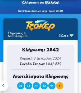 Η κλήρωση 2842 του Τζόκερ, πραγματοποιήθηκε σήμερα 08/12/2024 και οι τυχεροί αριθμοί που κληρώθηκαν είναι οι 28,36,41,42,44 με τζόκερ τον αριθμό 6.
