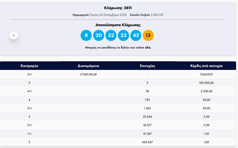 Στην σημερινή (26.9.2024) κλήρωση που μοίραζε πάνω από 17 εκατ. ευρώ στην πρώτη κατηγορία, δεν βρέθηκε μεγάλος νικητής.