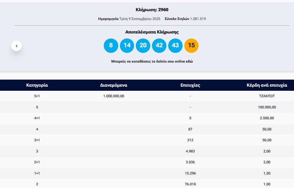 Οι τυχεροί αριθμοί της κλήρωσης είναι οι εξής: 8, 14, 20, 42, 43 και αριθμός Τζόκερ το 15.