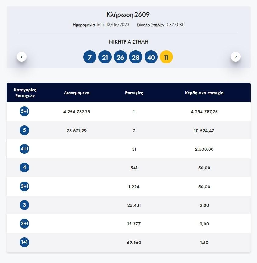 Συνολικά στη δεύτερη κατηγορία βρέθηκαν άλλοι πέντε νικητές από Περιστέρι, Χαλκίδα, Πτολεμαΐδα, Θεσσαλονίκη και Κρύα Βρύση Γιαννιτσών που κέρδισαν από 10.524 ευρώ έκαστος.