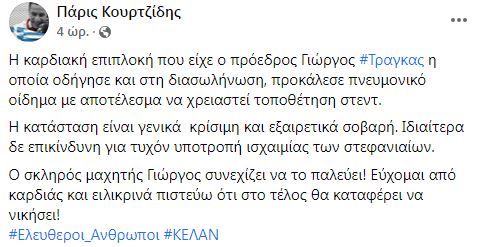 Σύμφωνα με τον εκπρόσωπο Τύπου του κινήματος «Ελεύθεροι Άνθρωποι» Πάρι Κουρτζίδη  η κατάσταση της υγείας του Γιώργου Τράγκα είναι «εξαιρετικά σοβαρή» και «ιδιαίτερα επικίνδυνη για τυχόν υποτροπή ισχαιμίας των στεφανιαίων».
