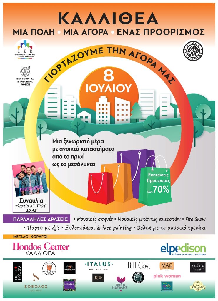 «Δεσμευόμαστε για ένα αξέχαστο εορταστικό φεστιβάλ αγορών με πολλές και γενναιόδωρες προσφορές από όλες τις επιχειρήσεις, με απρόσμενες αλλά ευχάριστες εκπλήξεις, με δροσιστικά και γευστικά κεράσματα σε πολλά σημεία της Καλλιθέας. Τη σκυτάλη θα λαμβάνουν εναλλάξ κατά τη διάρκεια της ημέρας μουσικές σκηνές και μπάντες πνευστών, fireshow, πάρτυ με dj’s, ξυλοπόδαροι, ledstiltwalker, facepainting και το μουσικό τρενάκι που υπόσχεται όμορφες βόλτες για τα παιδιά συνθέτοντας μια γιορτινή και ψυχαγωγική ατμόσφαιρα που θα ολοκληρωθεί στην πλατεία Κύπρου με τη μεγάλη συναυλία από τους «Enorasis» Την Παρασκευή 8 Ιουλίου διασκεδάζουμε, ψωνίζουμε, στηρίζουμε την τοπική αγορά και την πόλη μας!» τονίζει ο Εμπορικός Σύλλογος Καλλιθέας