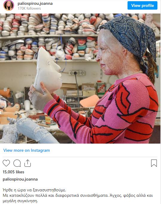 H Ιωάννα Παλιοσπύρου στη νέα της δημοσίευση, κρατά τη μάσκα στα χέρια της και δείχνει το πρόσωπό της.