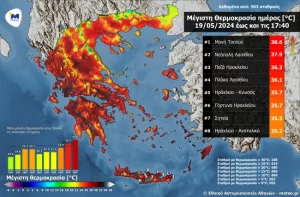 Εξαιρετικά υψηλές για την εποχή θερμοκρασίες σημειώθηκαν στα κεντρικά και νότια τμήματα της Ελλάδας την Κυριακή 19 Μαΐου.