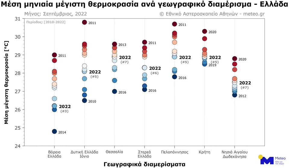 Η μέση μέγιστη θερμοκρασία τον φετινό Σεπτέμβριο ήταν οριακά υψηλότερη από τον Σεπτέμβριο του 2021 για τη Στερεά Ελλάδα, τη Θεσσαλία, τα νησιά του Αιγαίου και την Κρήτη, παρά το ιδιαίτερα ψυχρό διάστημα στα τέλη του μήνα.