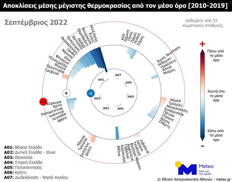Οι μεγαλύτερες θερμοκρασιακές αποκλίσεις καταγράφηκαν στην Αλεξανδρούπολη, όπου η θερμοκρασία κυμάνθηκε έως και 8,4°C χαμηλότερα από τα κανονικά για την εποχή επίπεδα μεταξύ 19 και 27 Σεπτεμβρίου 2022, ενώ συνολικά τις 24 από τις 30 ημέρες του μήνα καταγράφηκαν αρνητικές αποκλίσεις. Στην Αθήνα και τη Θεσσαλονίκη καταγράφηκαν παρόμοιες αρνητικές αποκλίσεις (-1,1°C), με 17 ημέρες του μήνα να καταγράφονται αρνητικές αποκλίσεις στην Αθήνα και 18 ημέρες στη Θεσσαλονίκη.