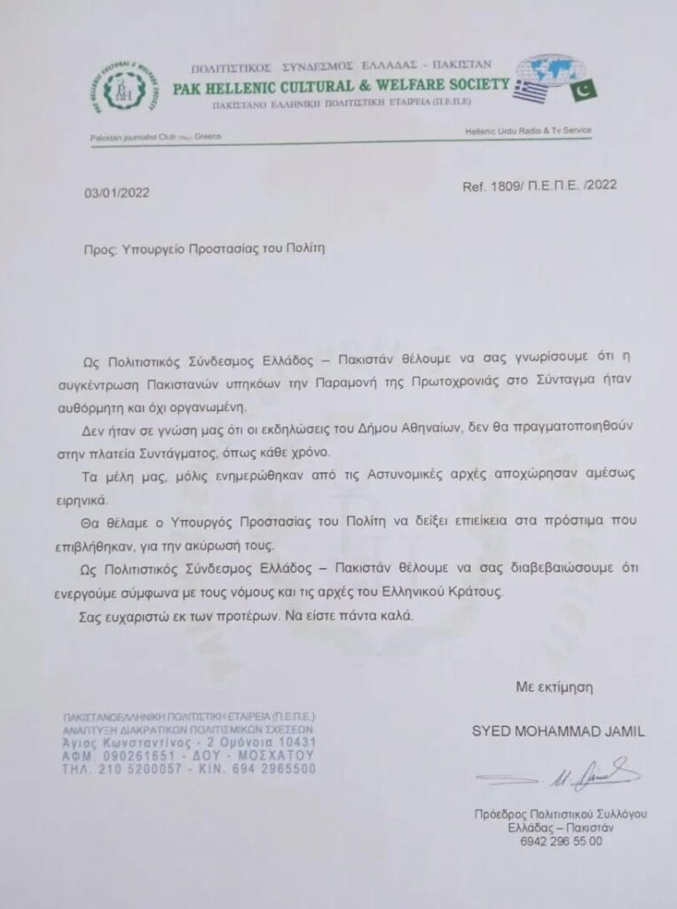 Στην επιστολή, που υπογράφει ο πρόεδρος του συλλόγου Syed Mohammad Jamil, η συγκέντρωση χαρακτηρίζεται «αυθόρμητη και όχι οργανωμένη», καθώς δεν ήταν σε γνώση τους ότι οι εκδηλώσεις του Δήμου Αθηναίων δεν θα πραγματοποιούντο στην πλατεία Συντάγματος όπως κάθε χρόνο.