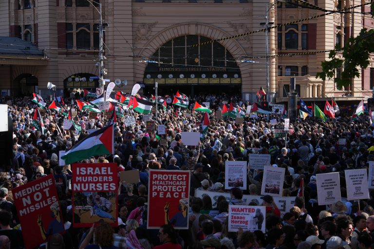 Μεγάλη συγκέντρωση πραγματοποιήθηκε και στην κεντρική επιχειρηματική συνοικία της Μελβούρνης, έξω από κεντρικό σιδηροδρομικό σταθμό. Πολλοί διαδηλωτές φορούσαν παλαιστινιακές μαντίλες και κρατούσαν παλαιστινιακές σημαίες.