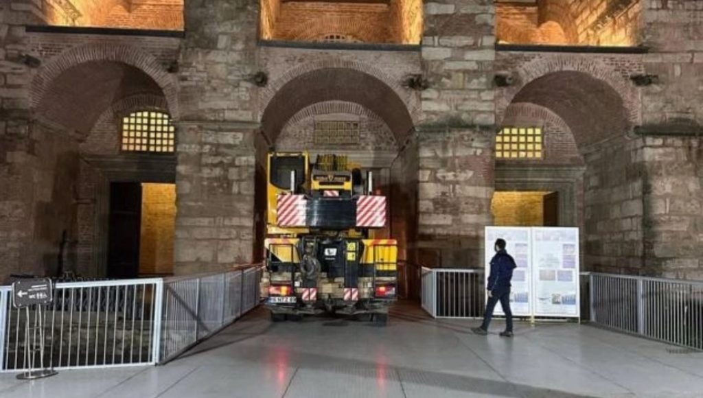 Εικόνες από το εσωτερικό της Αγίας Σοφίας, που κάνουν τον γύρο του κόσμου, δείχνουν γερανούς και φορτηγά να κινούνται πάνω στο ιστορικό δάπεδο, προκαλώντας έντονα ερωτήματα για το κατά πόσο προστατεύεται επαρκώς το μνημείο κατά τη διάρκεια των εργασιών αποκατάστασης. Οι φωτογραφίες από την αντισεισμική θωράκιση της σχεδόν 1.500 ετών Αγίας Σοφίας έχουν προκαλέσει κύμα αντιδράσεων.